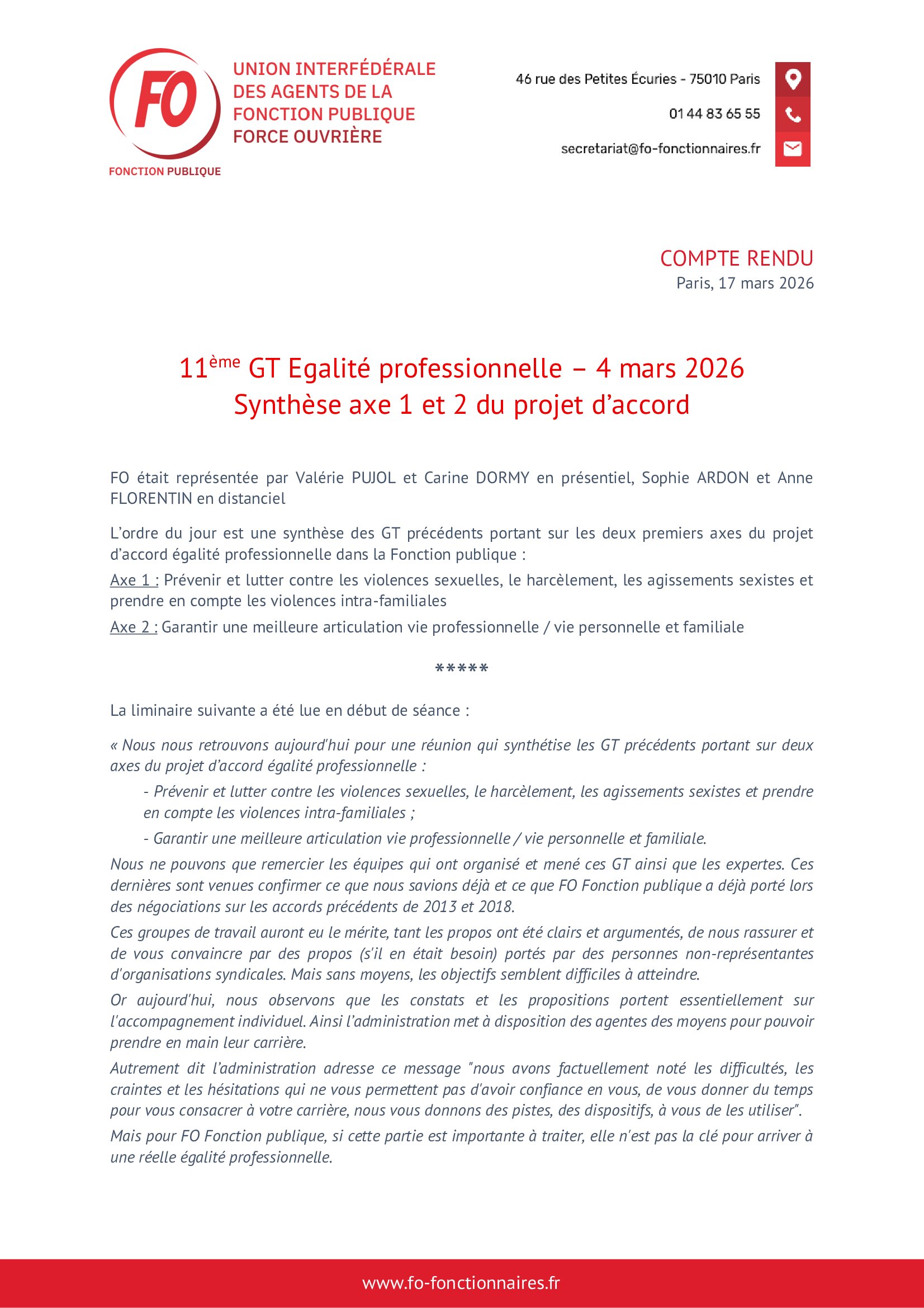 Accueil A la une 11ème GT Égalité professionnelle – 4 mars 2026 Synthèse axe 1 et 2 du projet d’accord