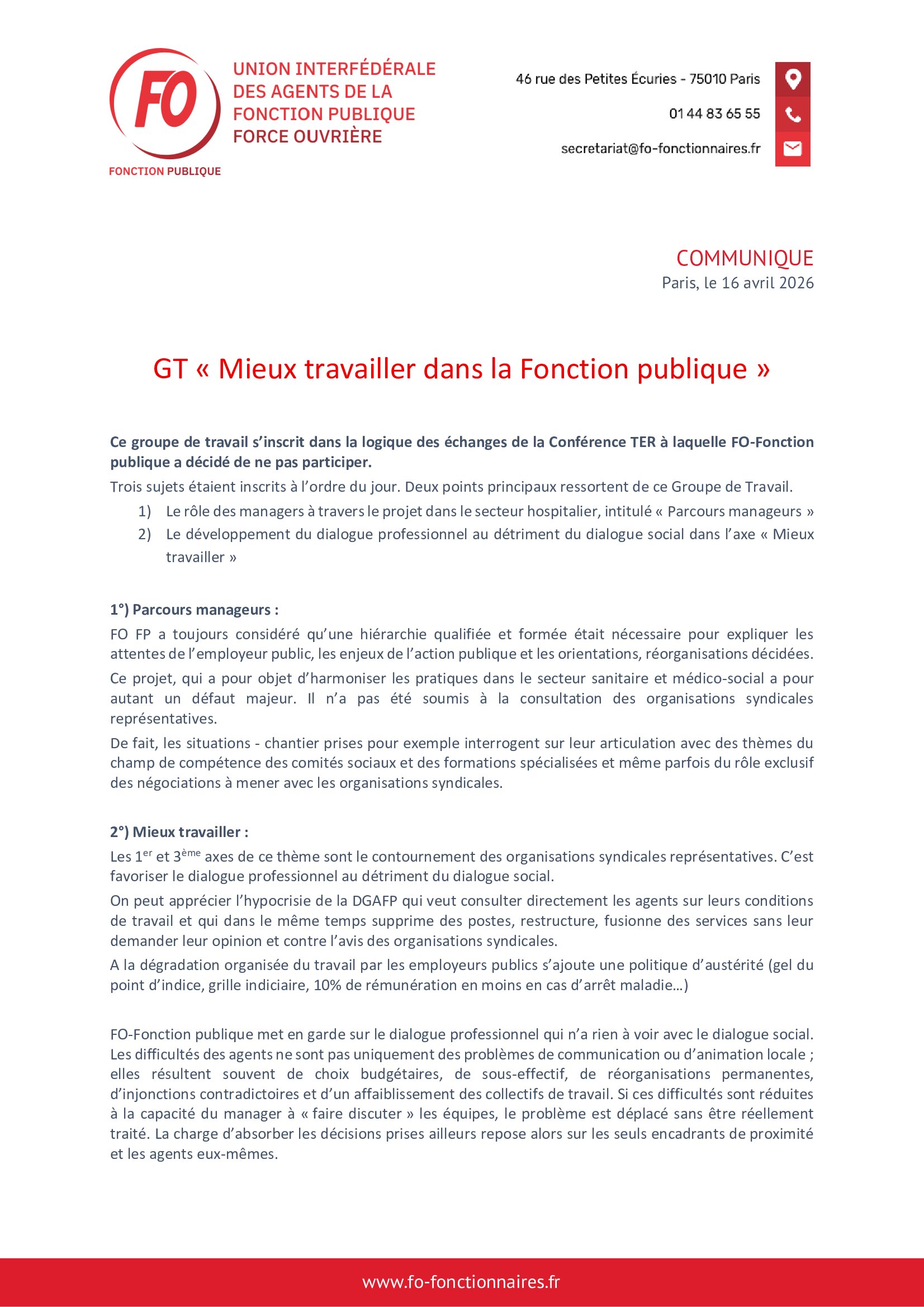 Accueil A la une Communiqué GT « Mieux travailler dans la Fonction publique »