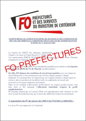 Accueil documents Compte rendu FO du CHSCT des juridictions administratives et déclaration préalable qui a permis d’alerter le comité sur la situation préoccupante du greffe du TA de Mayotte