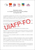 AccueildocumentsDéclaration des Organisations syndicales de la Fonction Publique : CGC, CGT, FA, FO, FSU, Solidaires, ainsi que le communiqué de presse FO suite à la réunion de l’Assemblée plénière du conseil commun de la Fonction Publique du 22 janvier 2020