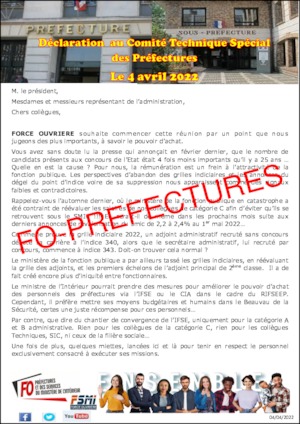 Accueil Comité technique spécial Déclaration préalable FO au CTSP du 4 avril 2022