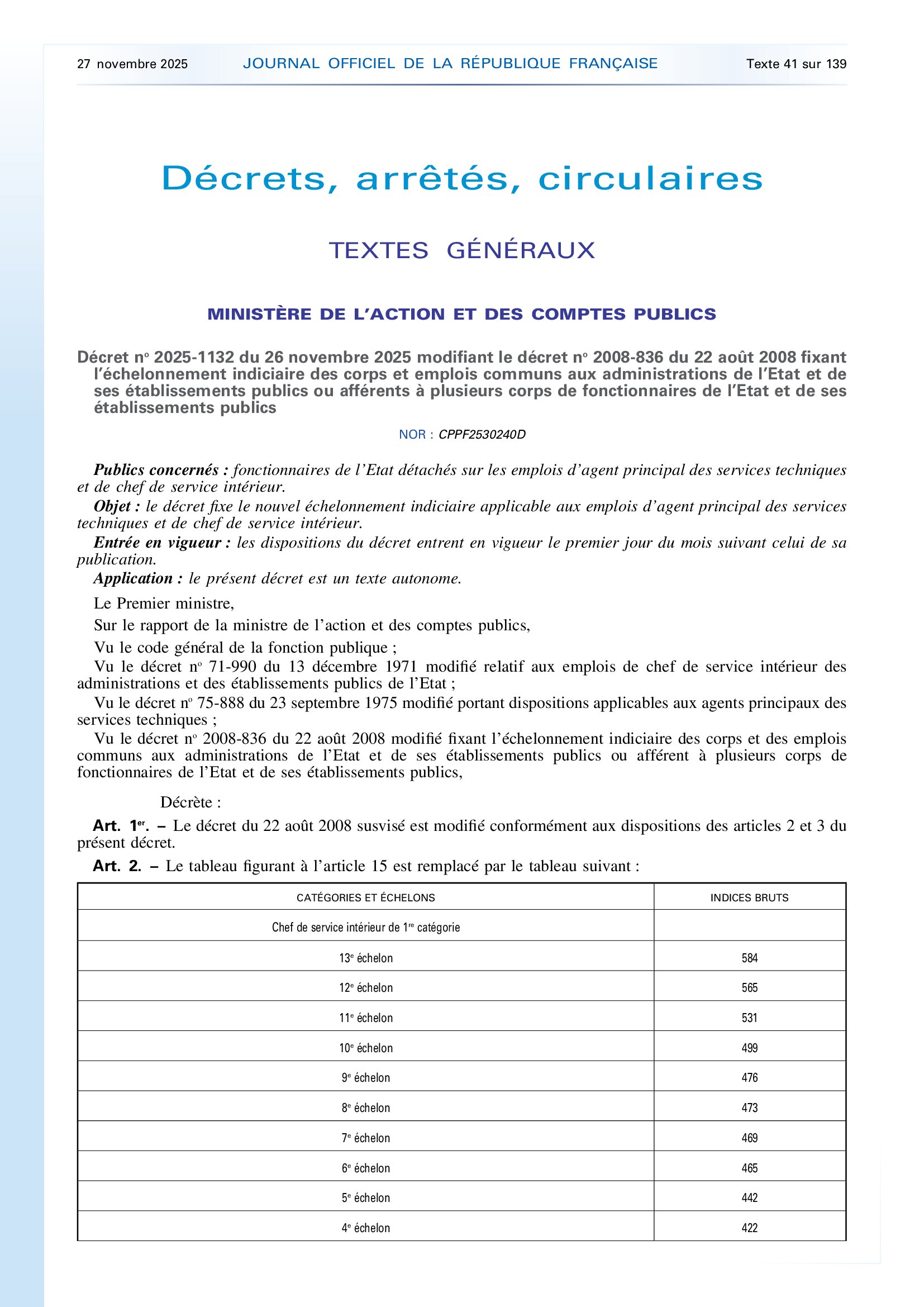 Décret no 2025-1132 du 26 novembre 2025 modifiant le décret no 2008-836 du 22 août 2008 fixant l’échelonnement indiciaire des corps et emplois communs aux administrations de l’Etat et de ses établissements publics ou afférents à plusieurs corps de fonctionnaires de l’Etat et de ses établissements publics
